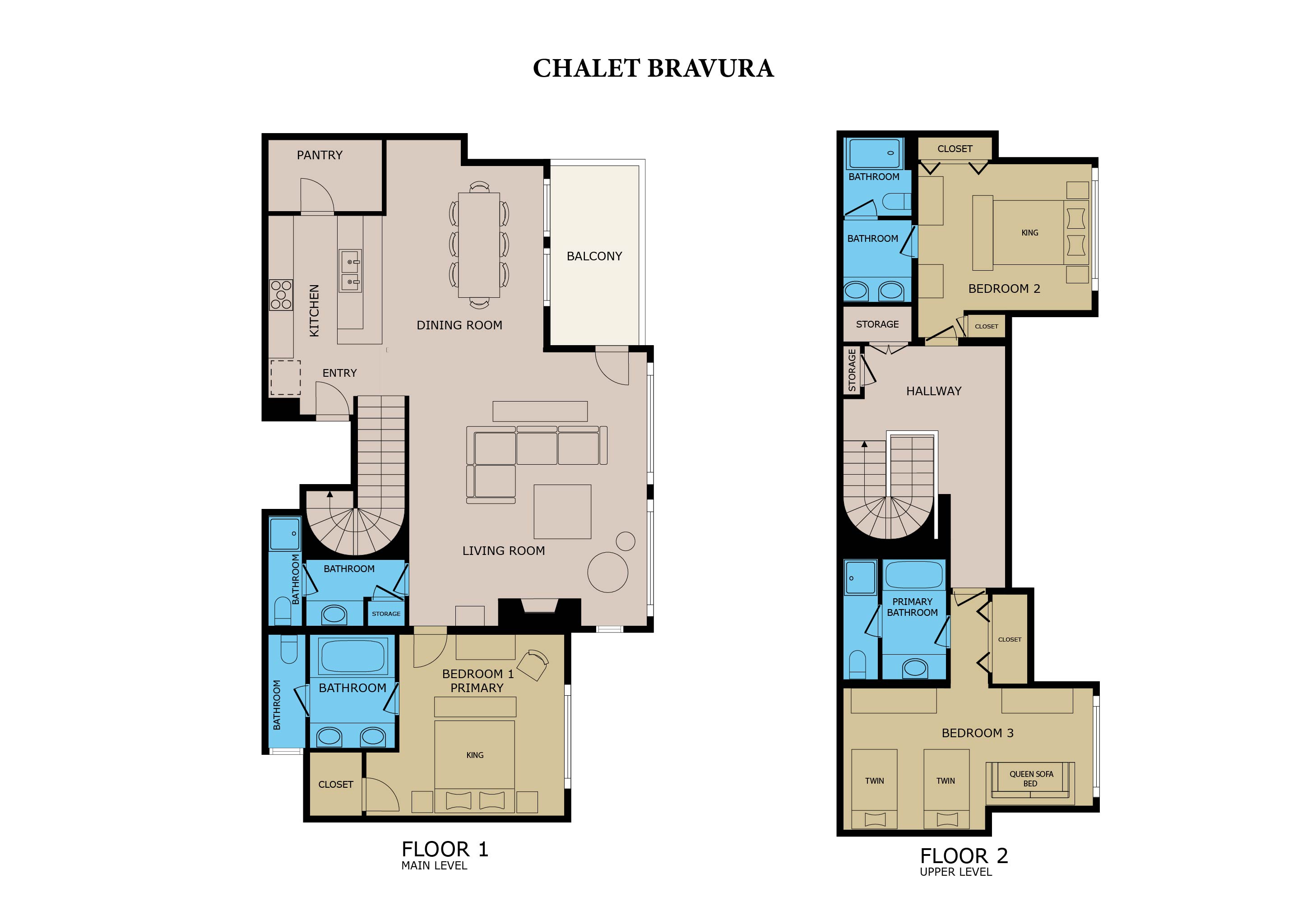 Upon entering on the upper level, you are immediately greeted with a vaulted ceiling with a wall of windows offering views of the ski runs straight ahead. Two of the three bedrooms are located on this level. One features a king bed, big screen TV, and an ensuite bathroom with walk-in shower and double vanity. The second bedroom has two twin beds and a queen sofa bed—perfect for kids or friends—along with a large TV, blackout shades, and an ensuite bath with a shower/tub combo.