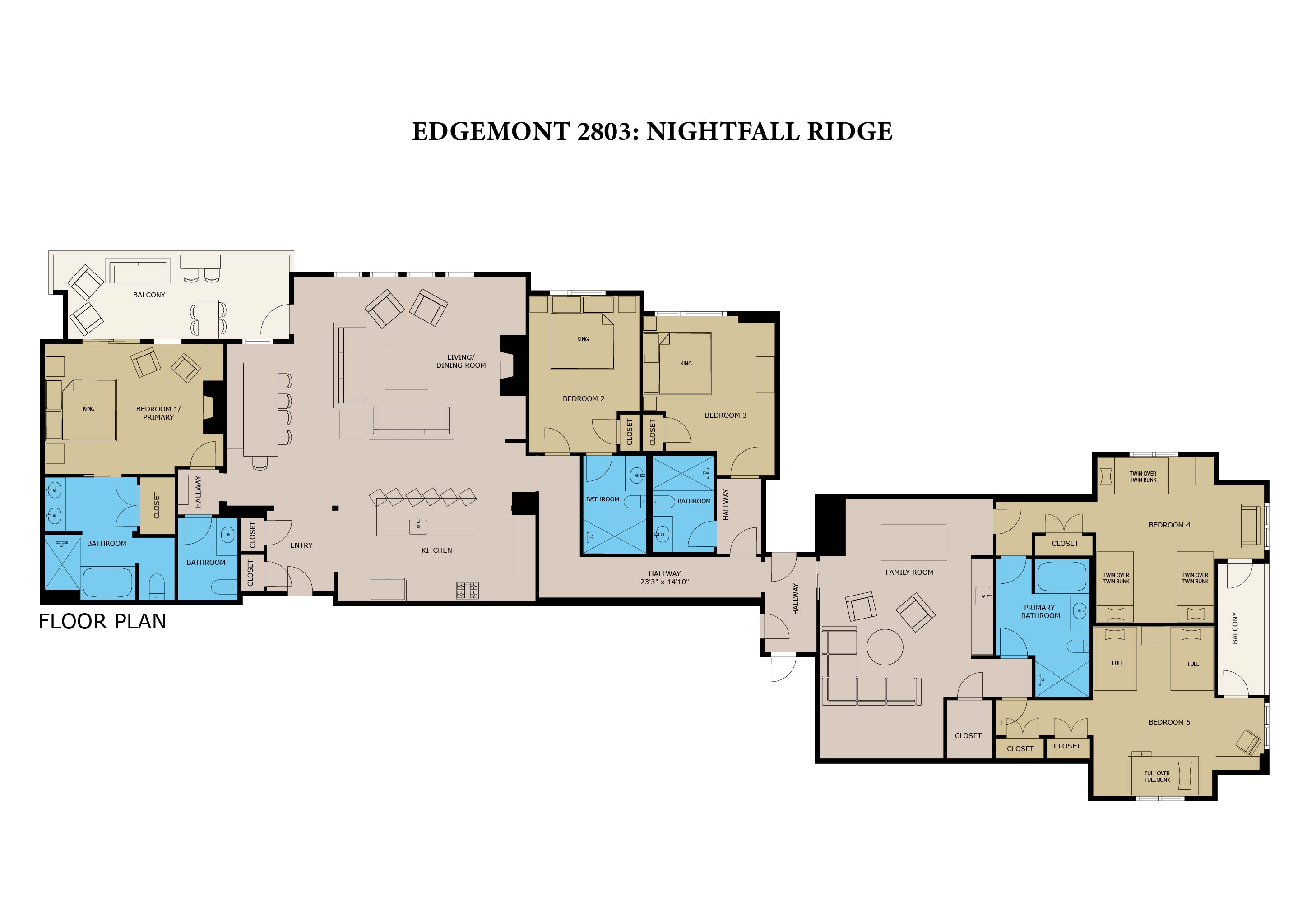 Continue down the hall to where the family fun begins. You’ll find the perfect hangout for playing pool, board games, and watching movies. Off the family room is a bunk room with three sets of twin-over-twin bunk beds. Another bedroom has one set of full-over-full bunk beds and two full beds. Both bedrooms share a private balcony and bathroom with separate tub and shower.