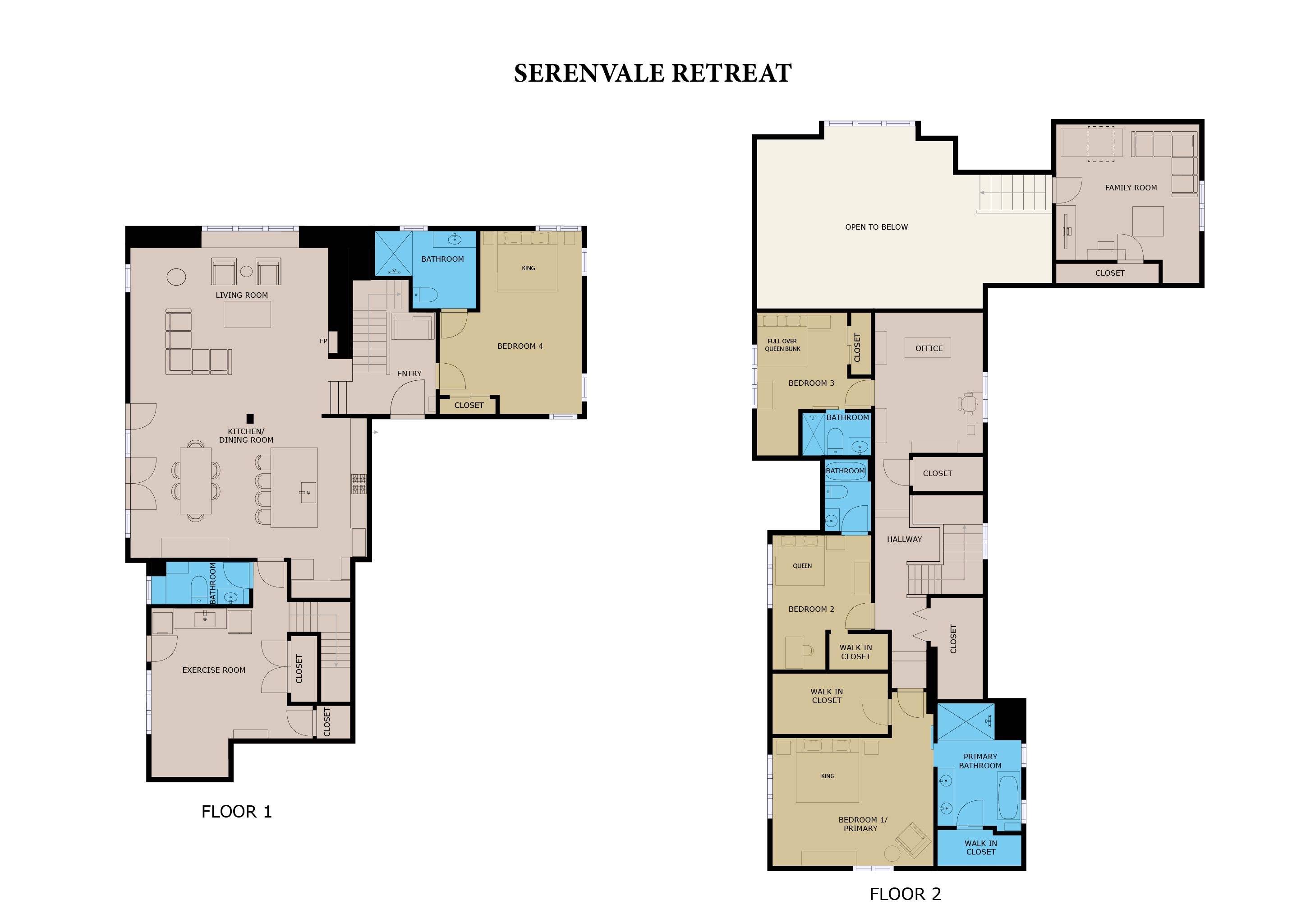 Serenvale Retreat’s layout provides multiple areas for work, play, and rest. On the main level off the kitchen, a large mudroom with ample storage for gear and outdoor clothing doubles as a fitness space with a weight machine. It also features a stacked full-size washer and dryer, an extra refrigerator, and opens to both the backyard and garage.