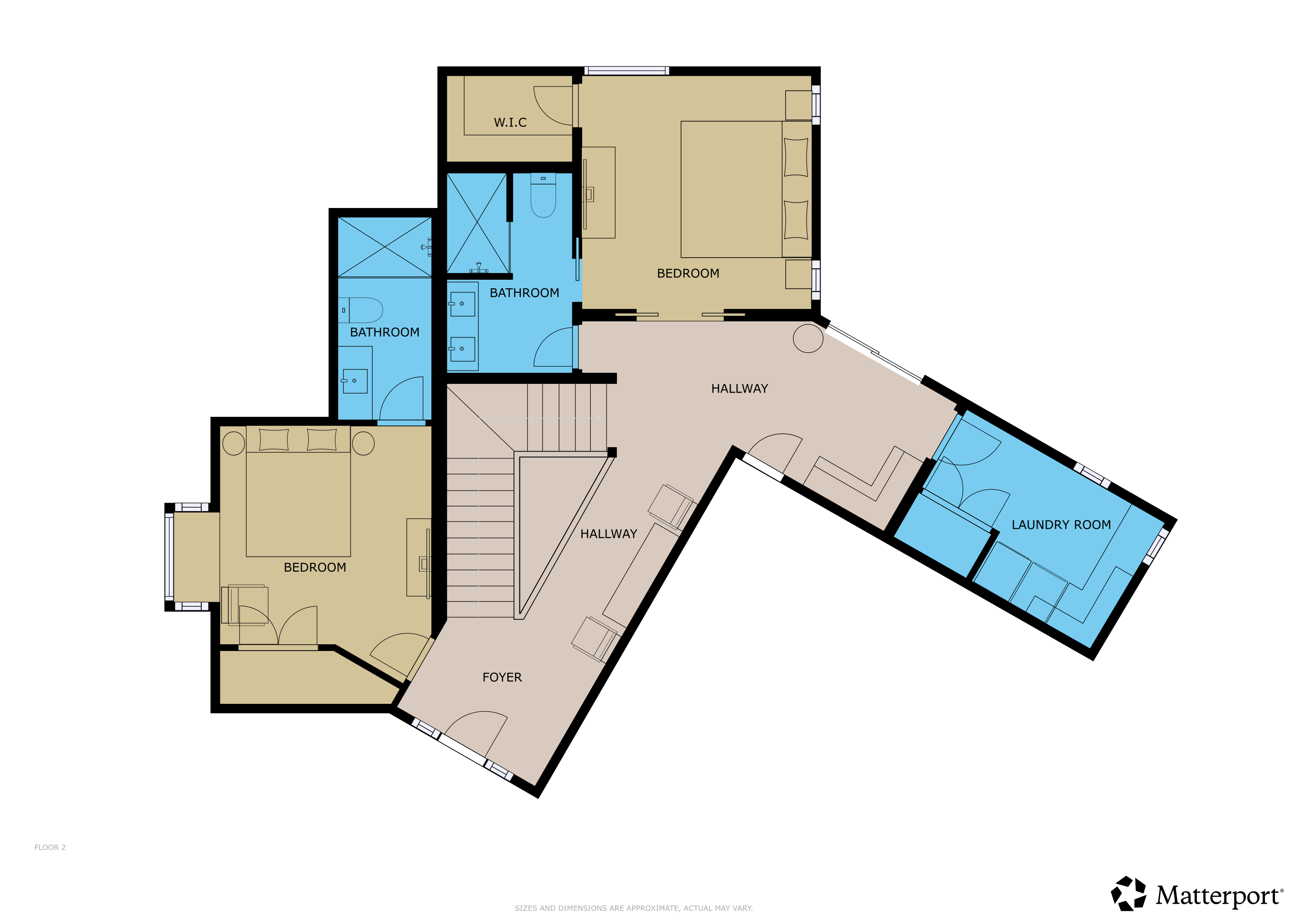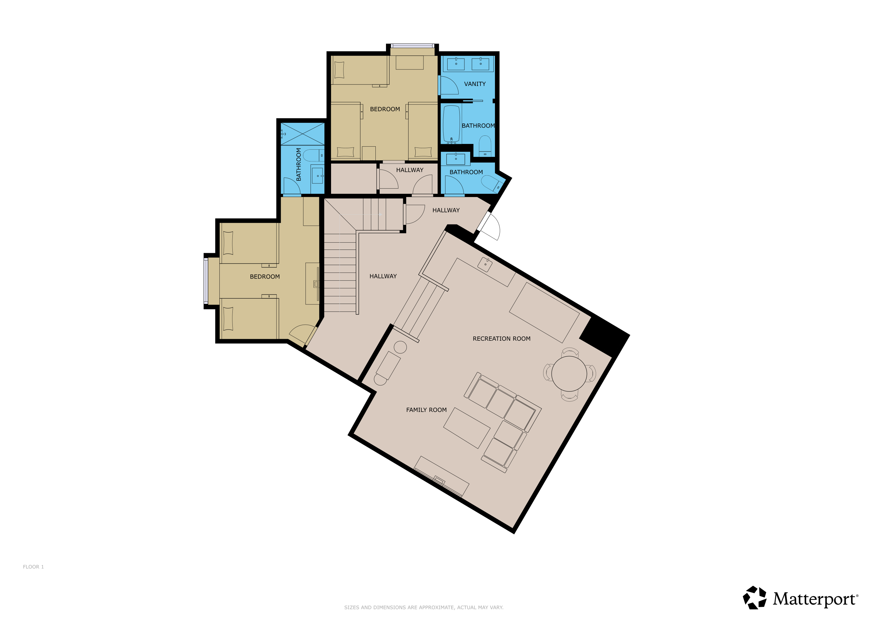 On the main level of the home, a queen room with an ensuite bathroom with a shower only is off the main entry as you come in the front door of the home. Down the hall is a king bedroom. The bathroom features a shower only and is accessible through the bedroom, as well as the hall.