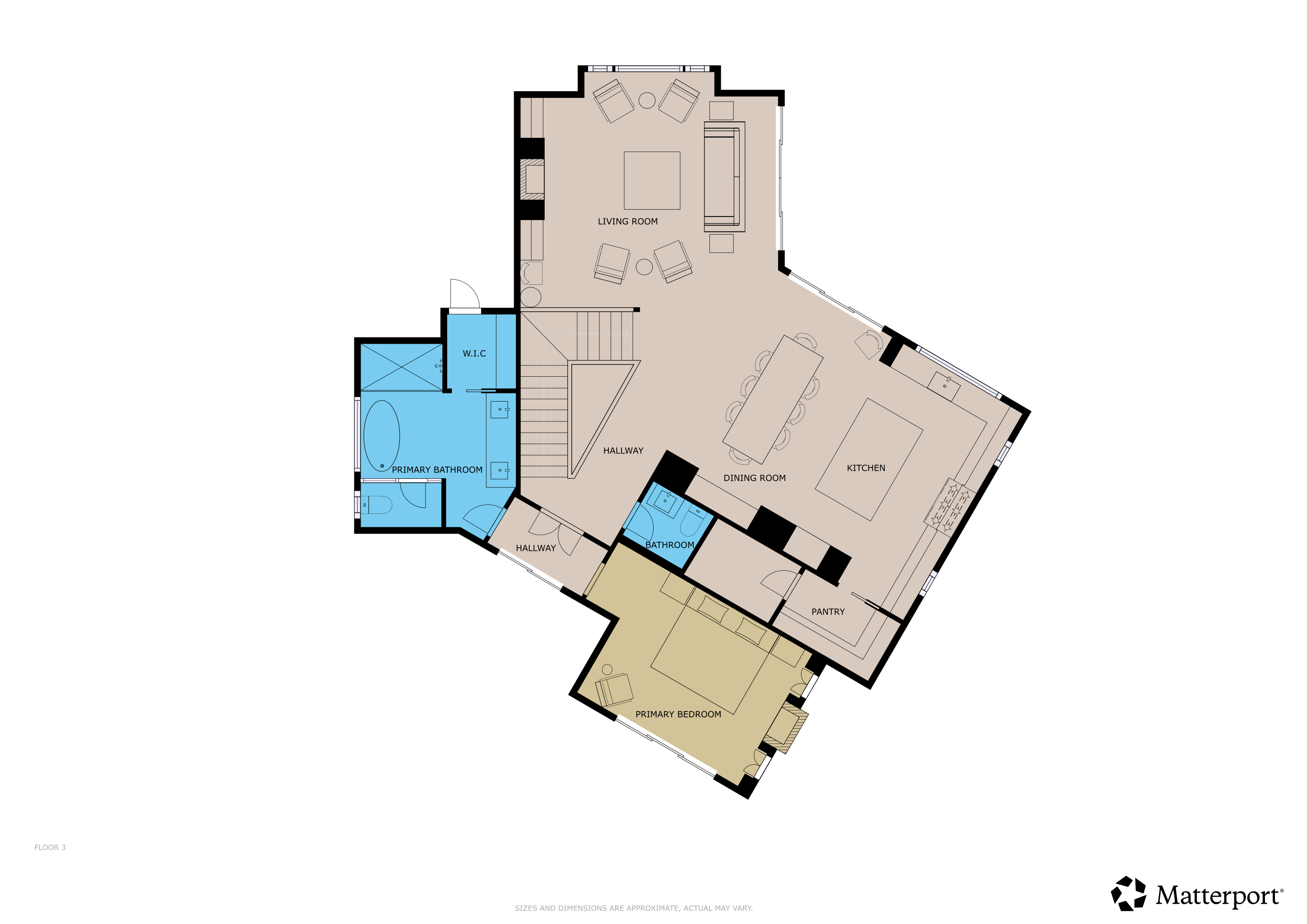 The primary king suite is on this upper level off the main living space. Relax in luxury with a fireplace, TV, private deck with firepit, and large bathroom with soaking tub and separate steam shower.