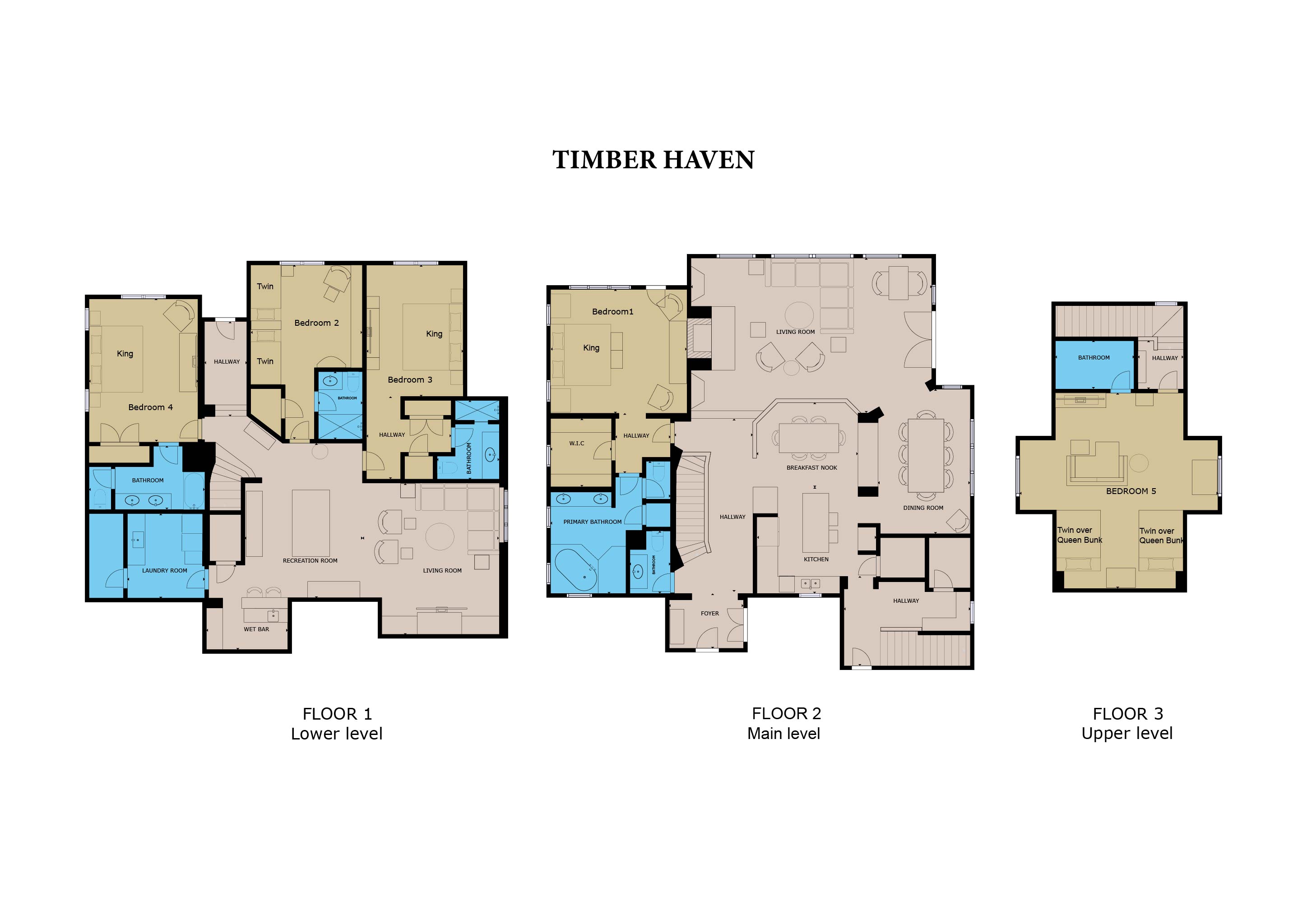 When everyone is ready for a good night’s sleep, Timber Haven’s five bedrooms provide peaceful retreats, each with its own style and comfort. The spacious primary king suite is located on the main level and features deck access, a large walk-in closet, and a spa-style ensuite bathroom with a double vanity, glass shower and jetted tub.
