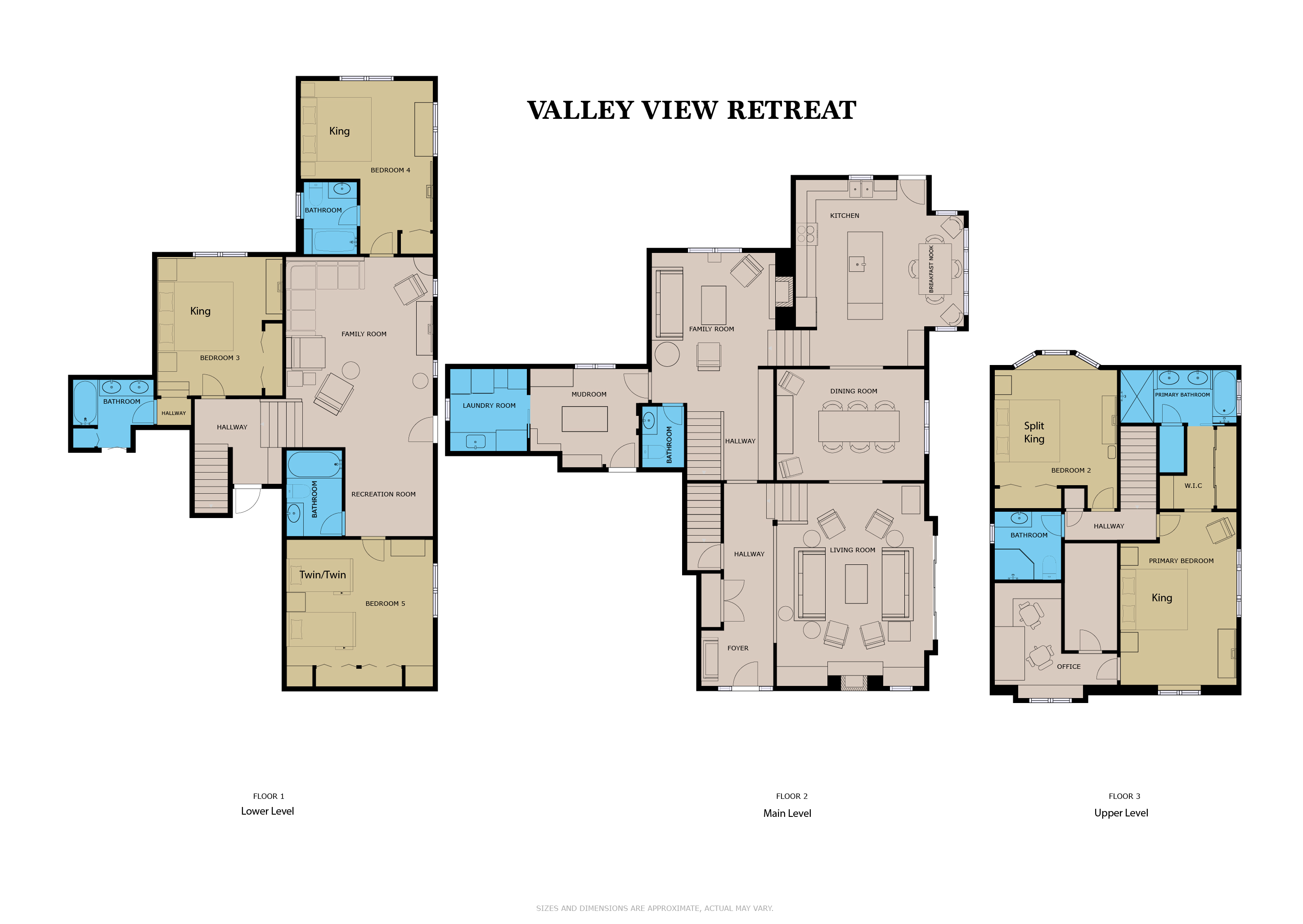 Upstairs, the primary suite features a king bed and ensuite bath with a double vanity, jetted tub, and separate shower. A private office with a large desk is located through the primary bedroom. Also on this level is a second bedroom with a split king bed and nearby hall bath with a walk-in shower.